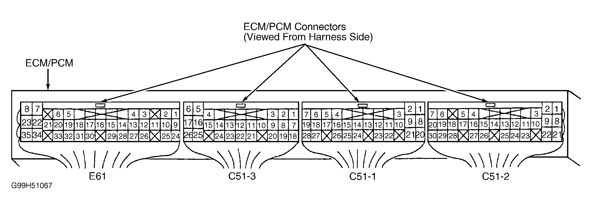 - Turn ignition switch ON and check voltage between ECM connector E61 terminal No. 30 and body ground. See Figure