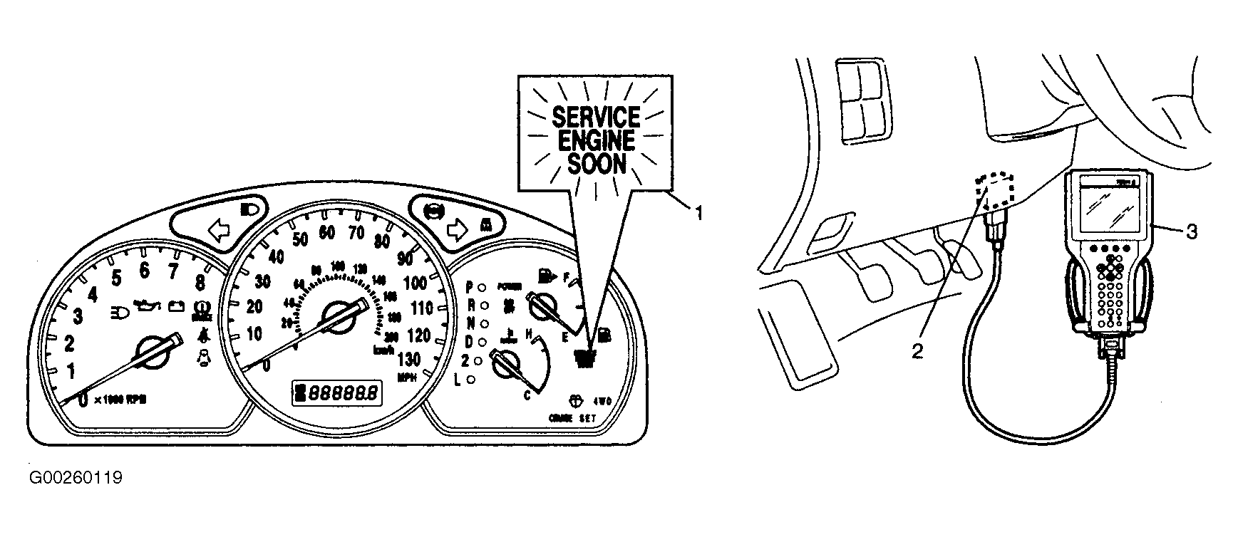 The Malfunction Indicator Light (MIL) is located at instrument cluster. See Fig 1 . As a bulb check, MIL illuminates for about 2 seconds when ignition switch is turned to ON position and engine is not running. MIL also illuminates when a system failure has been detected and a corresponding DTC has been set in ECM memory. MIL may also flash if ECM detects an engine misfire sever enough to cause catalytic converter failure. Not all trouble codes will activate MIL. If MIL is ON and no DTCs are in memory, problem may be intermittent. See INTERMITTENTS in TROUBLE SHOOTING - NO CODES in article.