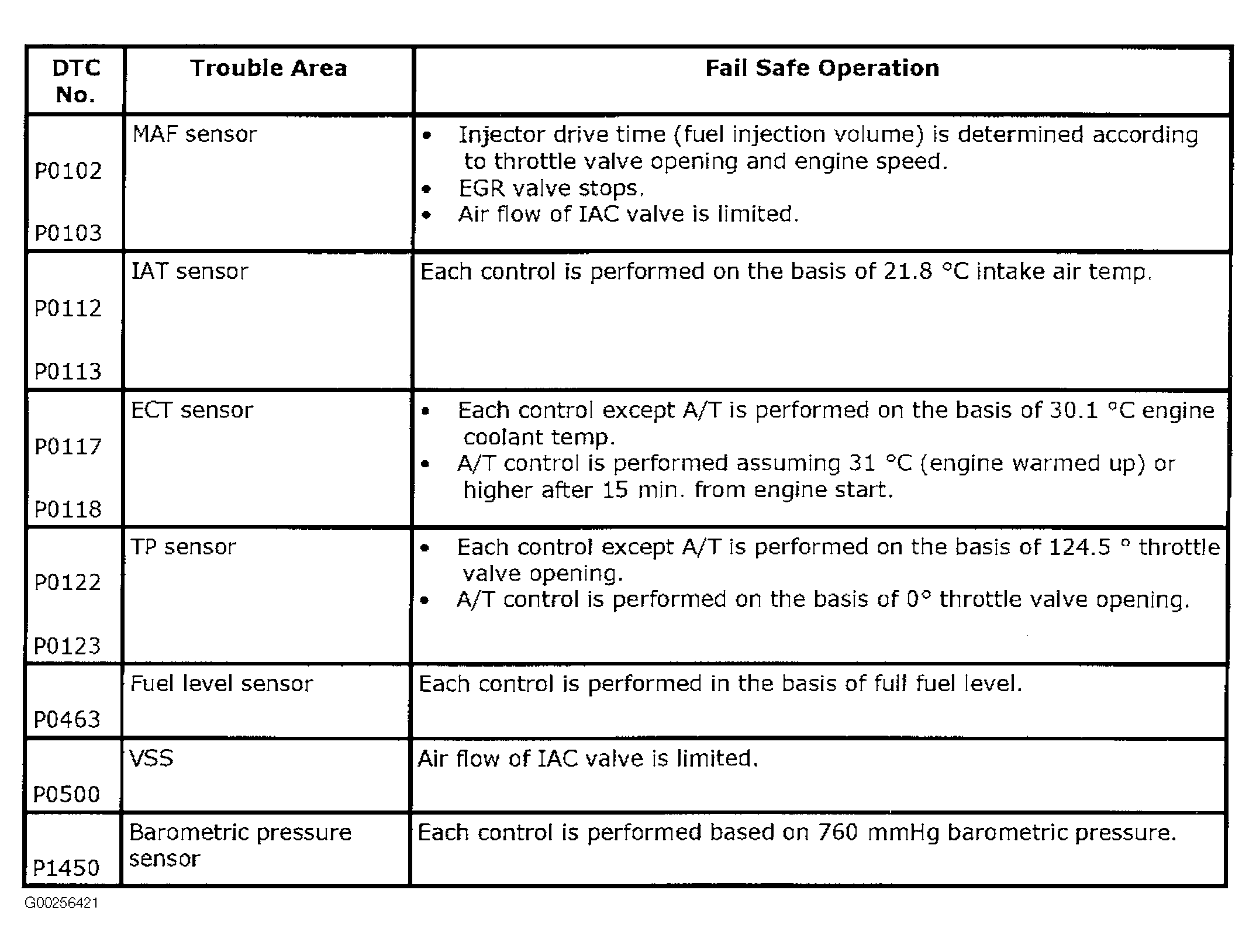 When a malfunction has occurred in specific areas of engine and emission control system, ECM enters "fail-safe function". When vehicle is operating in fail-safe function, ECM allows a lower level of engine performance to be available, allowing vehicle to be driven for service. When malfunction occurs a failure signal is sent to ECM, and ECM control over affected sensors and actuators is maintained on the basis of standard signals and/or a back-up program stored in ECM. While in fail-safe mode ECM ignores failure signal and/or CPU inputs. ECM will remain in fail-safe mode as long as malfunction is detected, fail-safe mode is canceled when ECM detects normal conditions. For fail-safe function parameters, and detected item. See Fig 1 .
