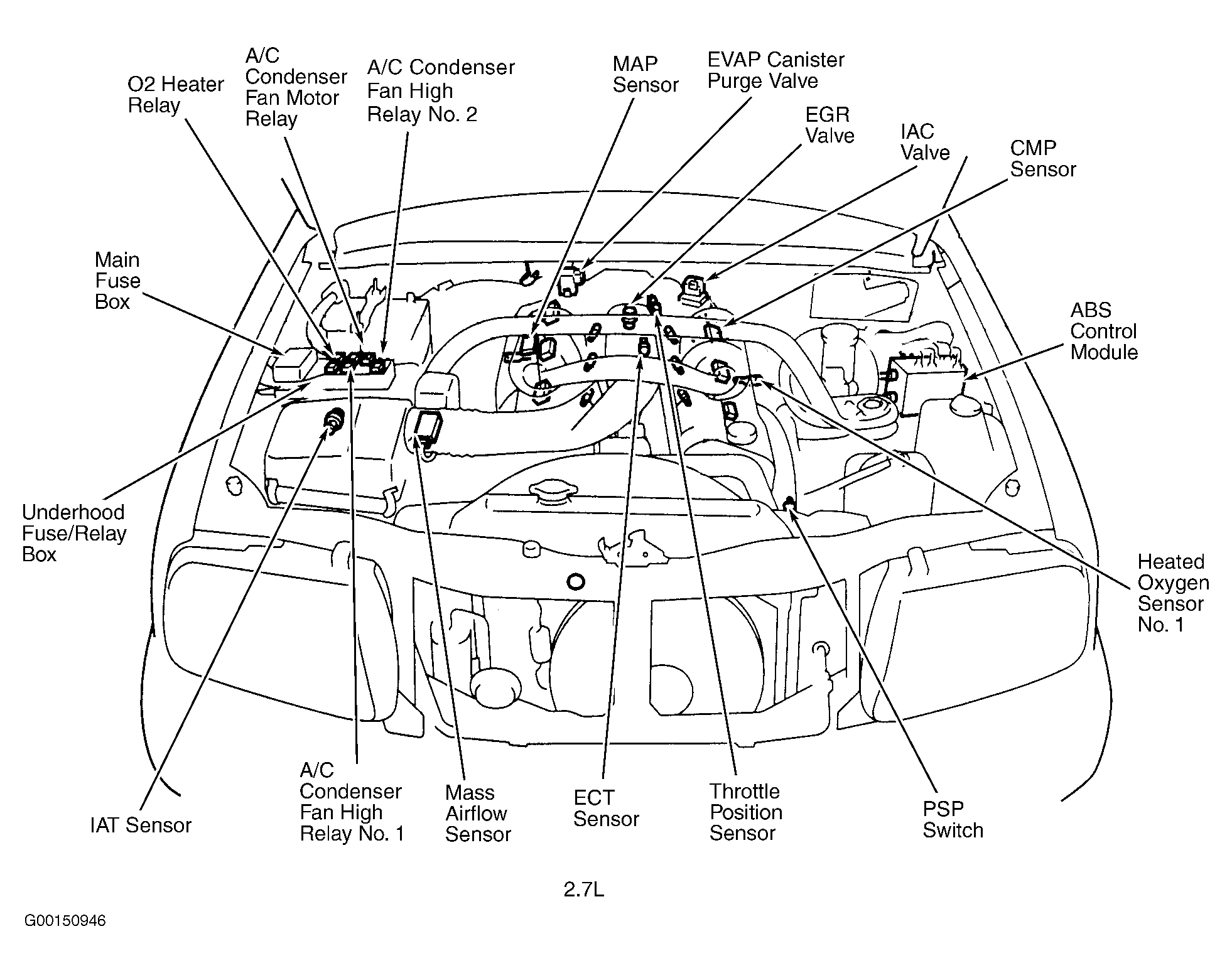 | ABS Control Module (2.7L) | At left rear corner of engine compartment. See Figure. |