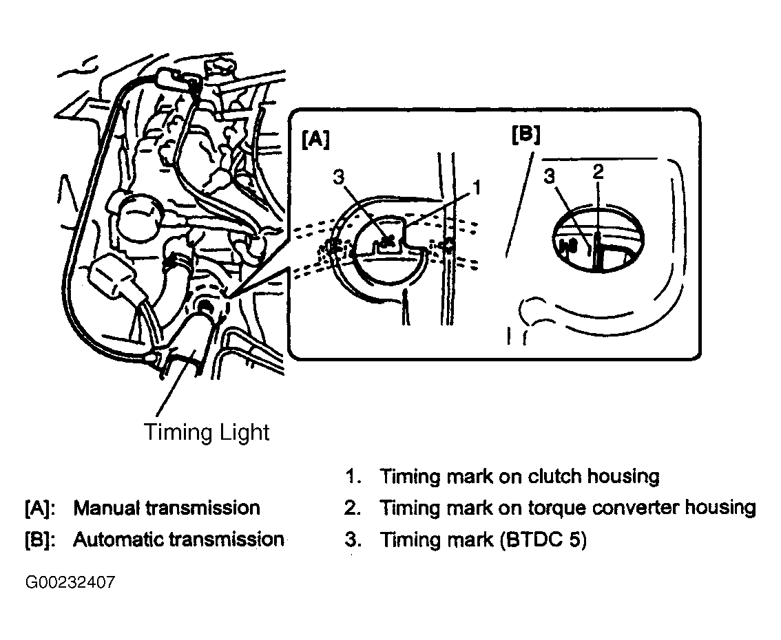 - Turn ignition switch to LOCK position. Ensure transmission is in Neutral or Park. Set parking brake. Remove timing hole cover, located on transaxle bell housing. See Fig 1
