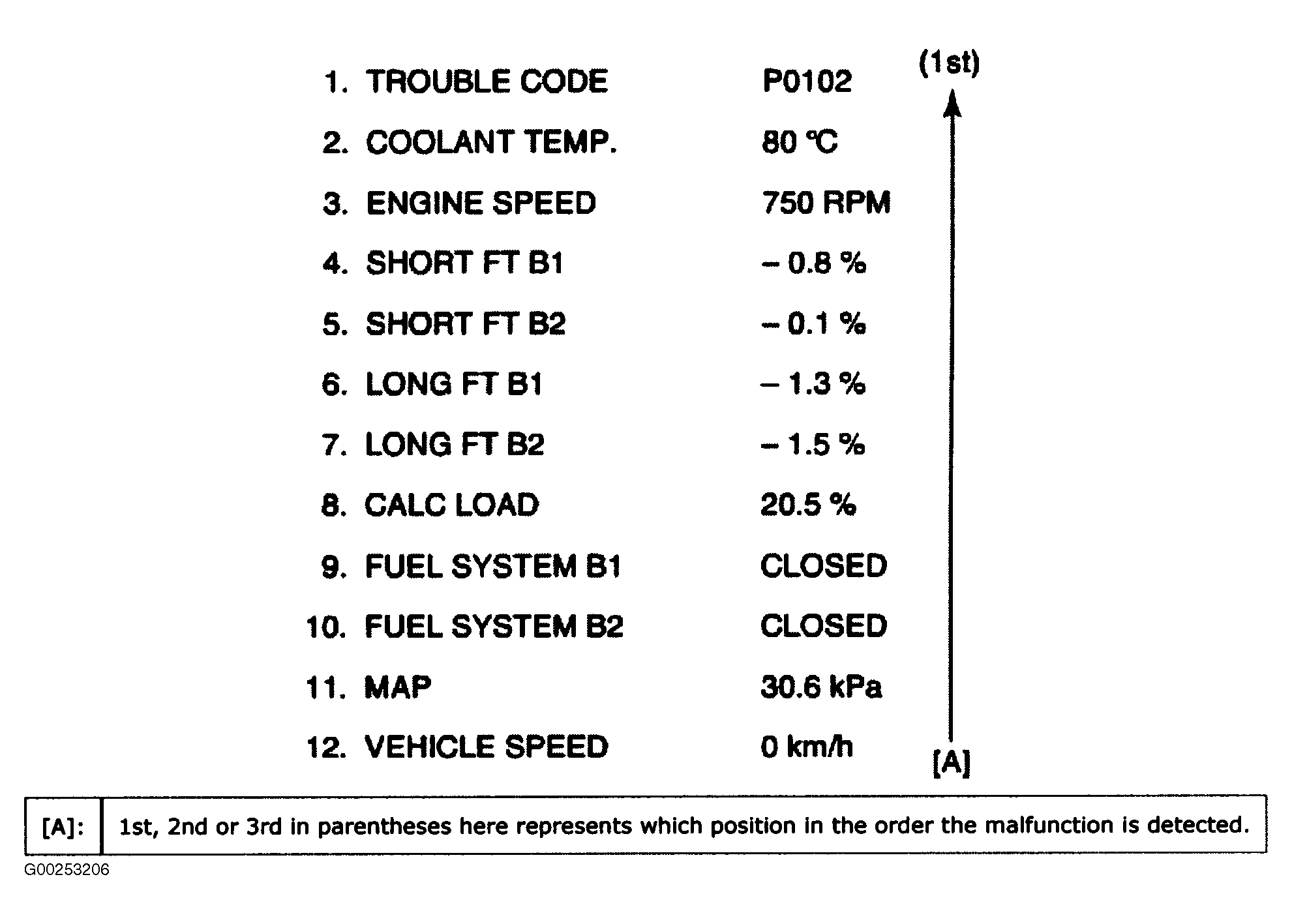Therefore, it is possible to know engine and driving conditions (e.g., whether the engine was warm or not, where the vehicle was running or stopped, where air/fuel mixture was lean or rich) when a malfunction was detected by checking the freeze frame data. Also, ECM (PCM) has a function to store each freeze frame data for three different malfunctions in the order as the malfunction is detected. Utilizing this function, it is possible to know the order of malfunctions that have been detected. Its use is helpful when rechecking or diagnosing a trouble.