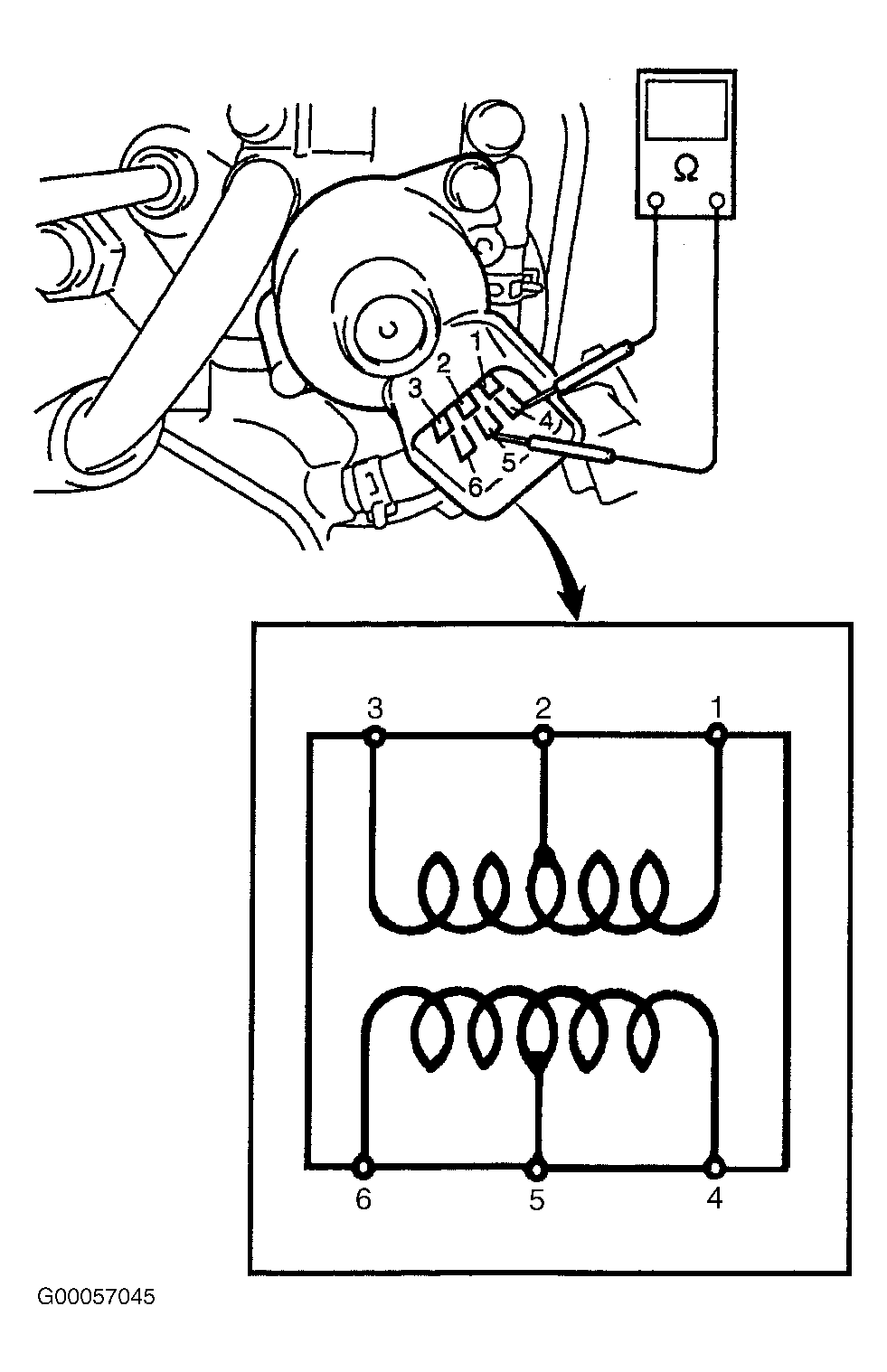 - Remove IAC valve electrical connector. Using DVOM, check resistance of IAC valve between terminals No. 1 and 2, 2 and 3, 4 and 5, and 5 and 6. See Fig 1