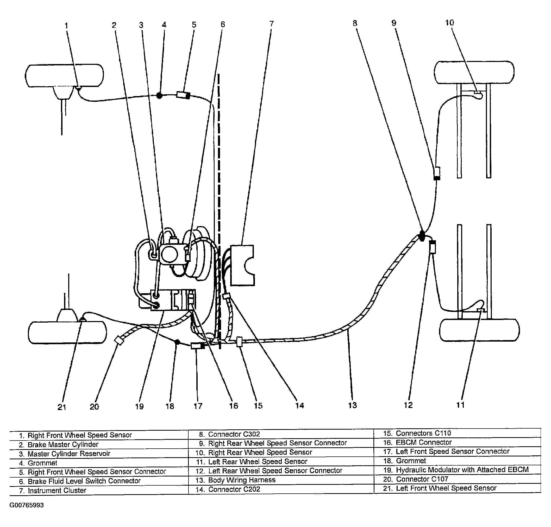 The ABS components include a hydraulic unit, an electronic brake control module (EBCM), two system fuses, four wheel speed sensors (one at each wheel), interconnecting wiring, the ABS indicator, the EBD indicator (which is connected to the parking lamp) and the rear disk brakes. See Figure for the general layout of this system.