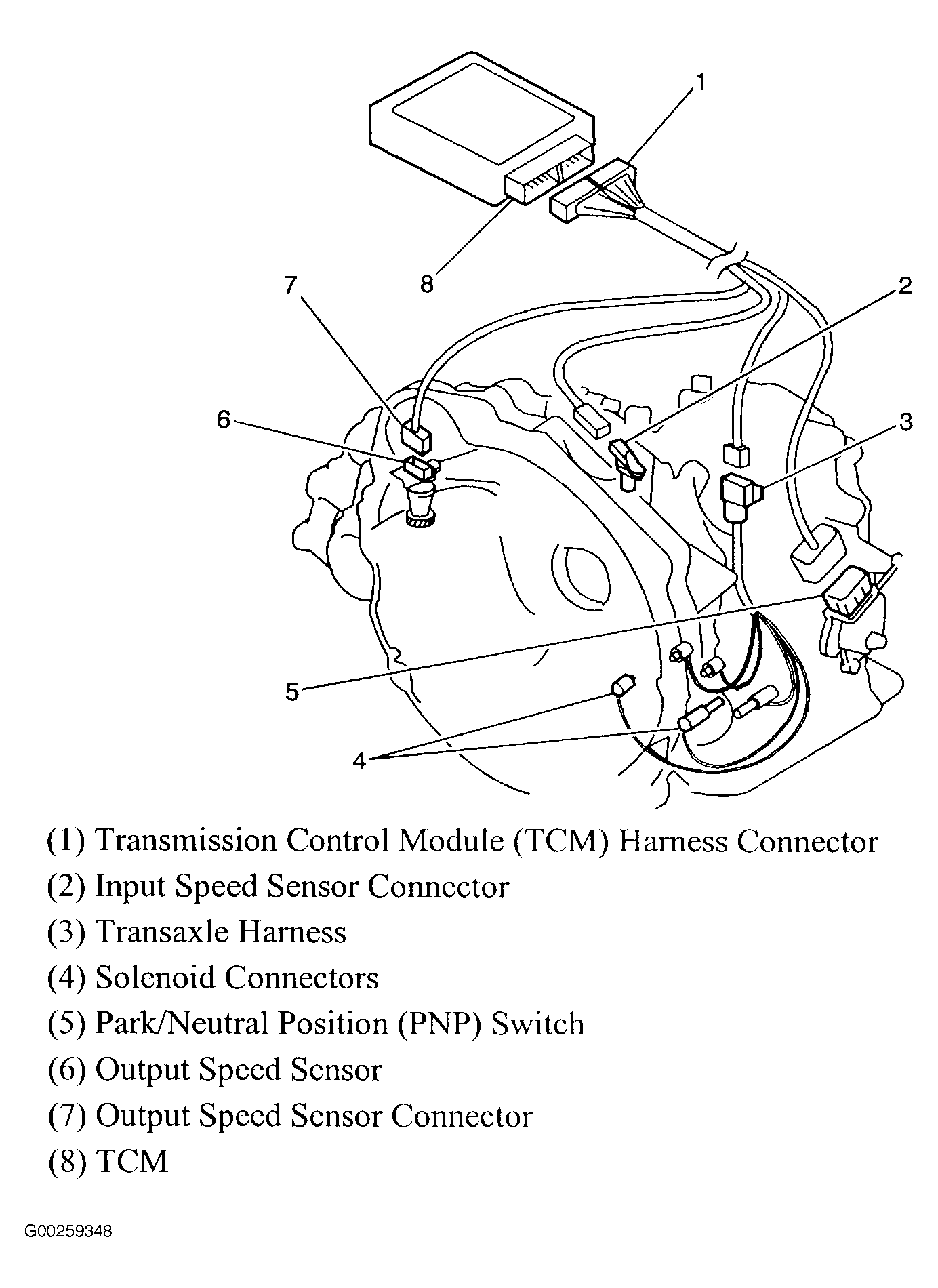 | Transmission Control Module (TCM) Harness Connector | On transmission control module. See Figure. |