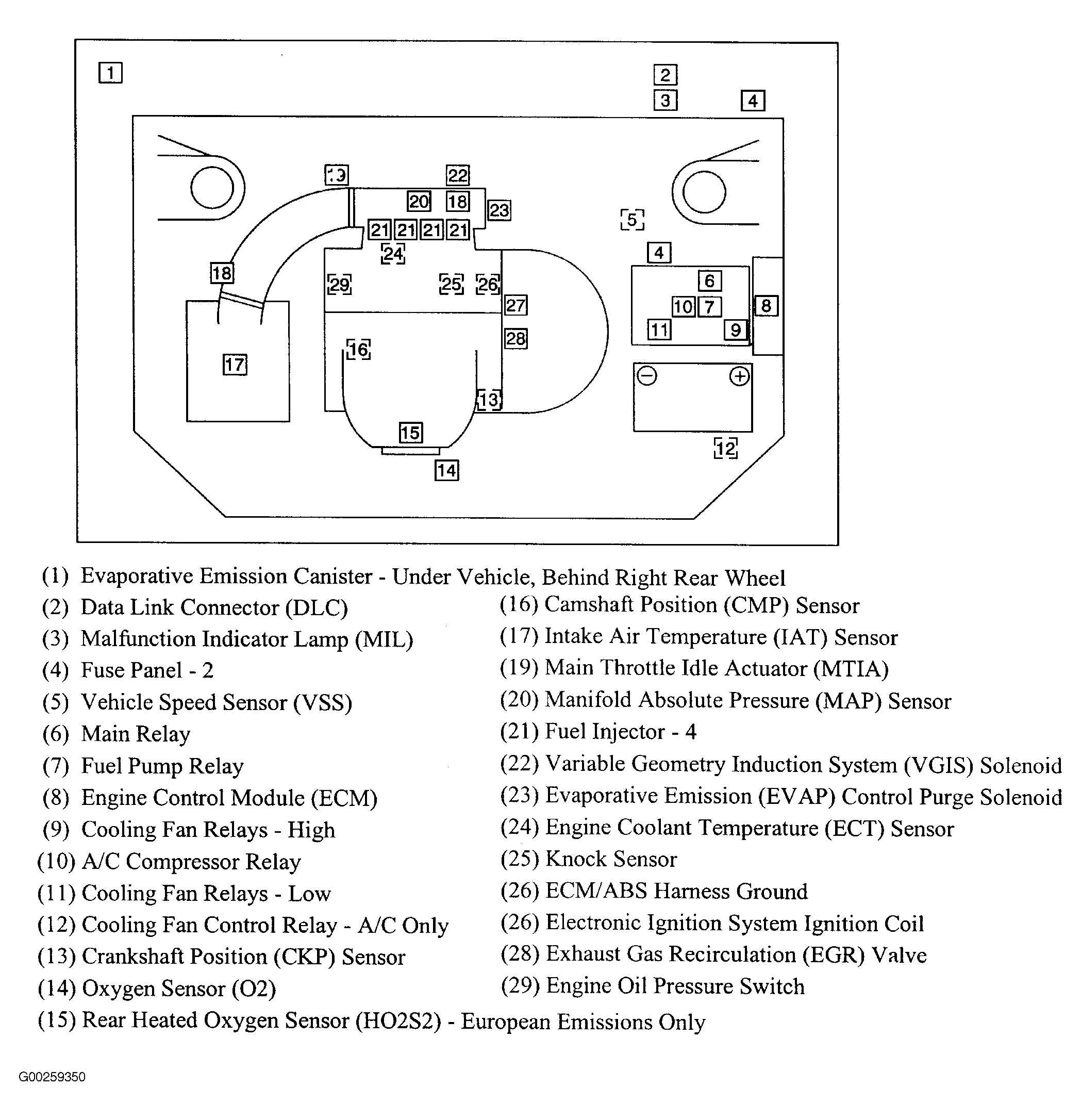 | Engine Control Module (ECM) | Left side of engine compartment. See Figure. |