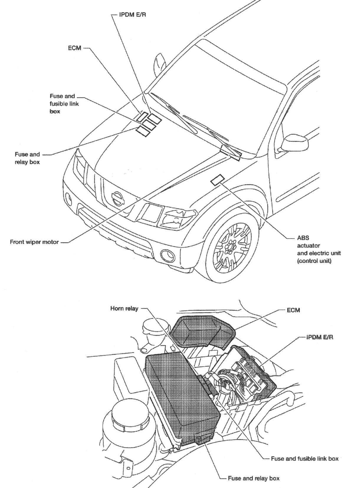| Intelligent Power Distribution Module (IPDM) E/R | Left rear engine compartment. See Figure. |
