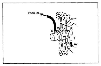 Apply 3.5 in Hg to port "S". Close port "R" and "Y" and blow air into port "T". Check that air comes out ports "U", "V", "Z", and "W". Release vacuum. Again blow into port "T" with "R" and "Y" closed. Air should not flow. See Fig 1.