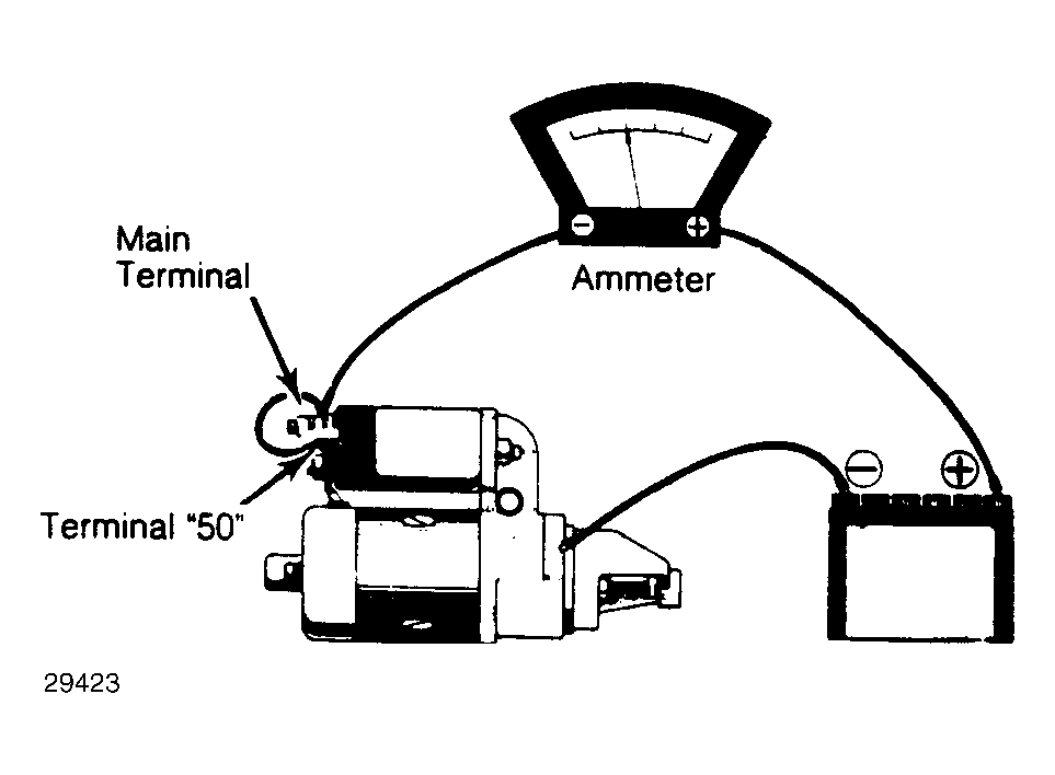 Place starter on bench. Connect a fully-charged 12-volt battery to starter. See Fig 1. Starter should rotate smoothly. Observe starter amp draw and RPM. See Starter No Load Test Chart.