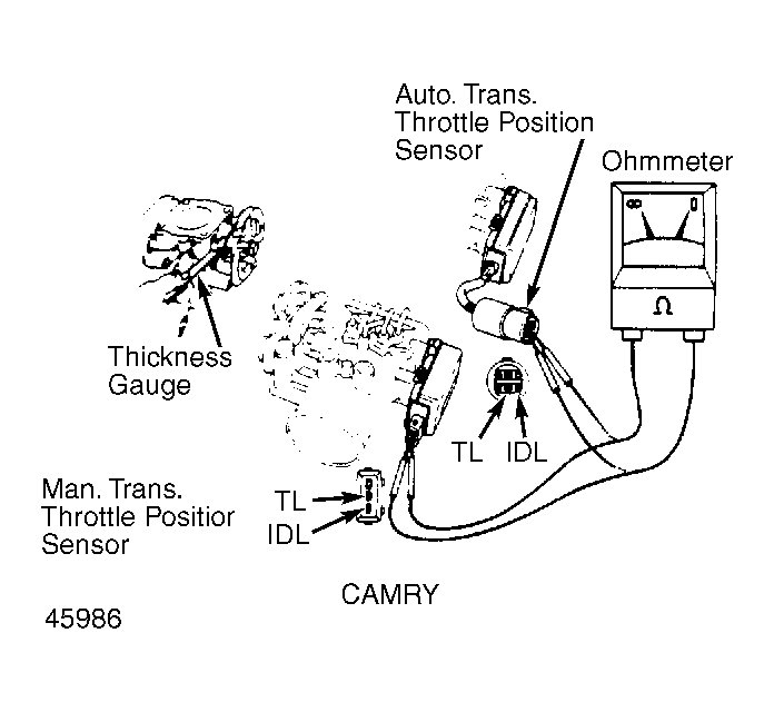 Turn Ignition Off and disconnect electrical connector at TPS. Insert a thickness gauge between throttle stop screw and throttle lever. Using an ohmmeter, check resistance values. See Fig 1. If values are not as specified in chart, adjust or replace TPS.