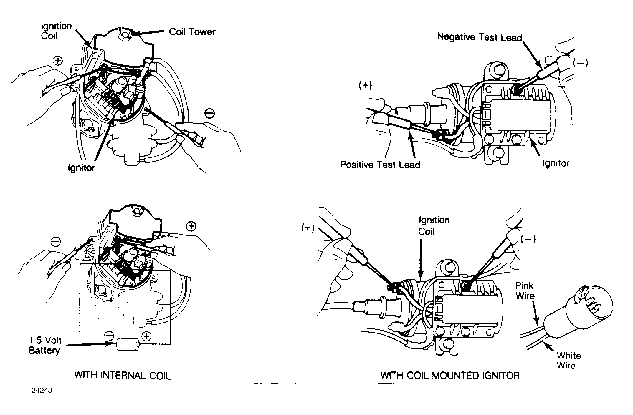 - Voltage at coil negative terminal should be as indicated in IGNITOR TEST VOLTAGE SPECIFICATIONS table. If not, replace ignitor.