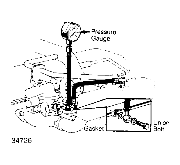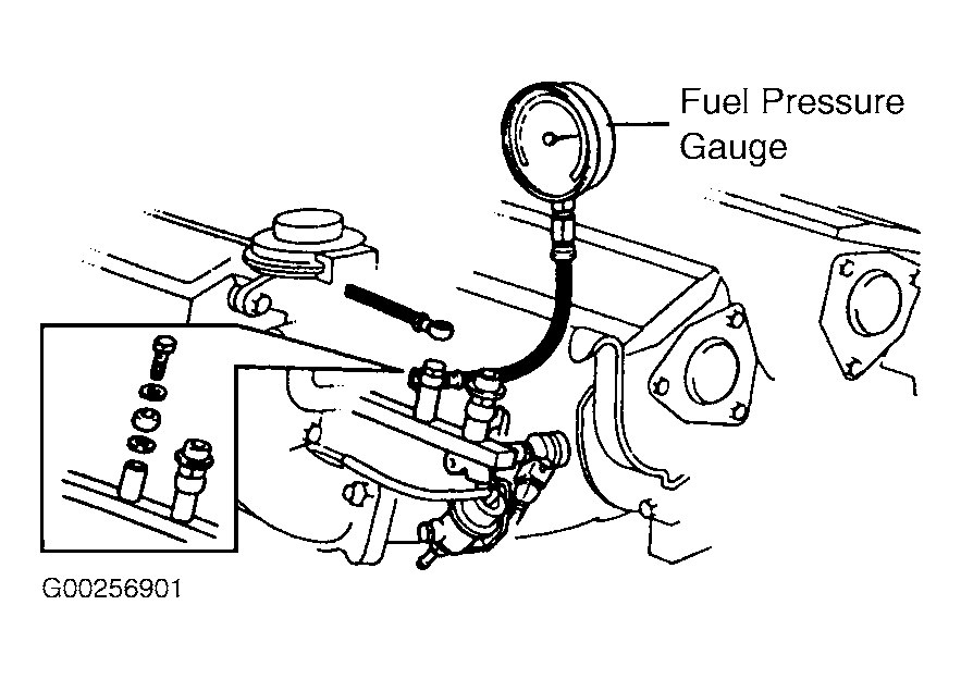 - With shop towel under delivery pipe fitting, remove the bolt and 2 gaskets from the delivery pipe. Drain fuel in delivery pipe. Install fuel pressure gauge. See Fig 1 or Fig 2