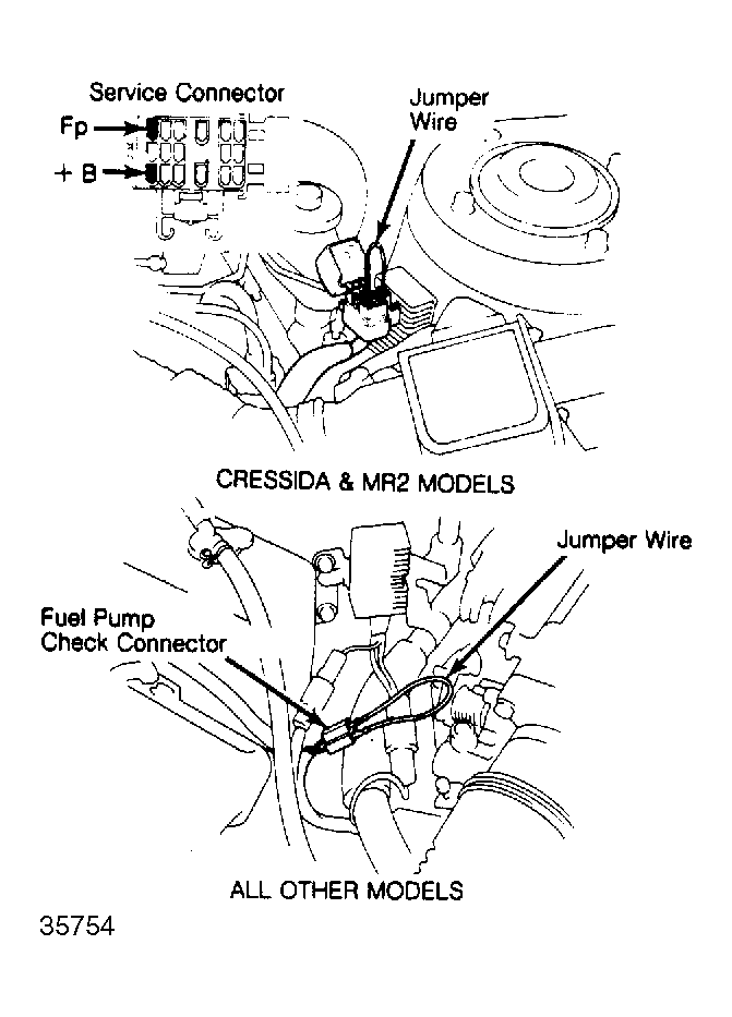 . Wipe off spilled fuel and reconnect negative battery cable. On Cressida and MR2 models, insert jumper wire between terminals "Fp" and "+ B" of service connector. On all other models, install jumper wire between both terminals of fuel pump check connector. See Figure. Turn ignition on.