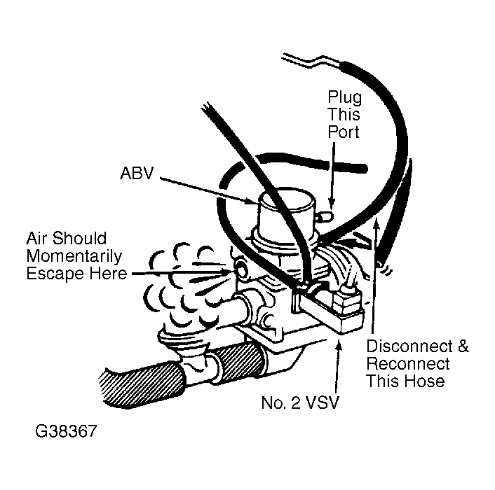 - Check operation of air by-pass valve (ABV). Disconnect air hose between ABV and exhaust pipe at ABV. Disconnect vacuum hose between ABV and No. 2 VSV at ABV and plug ABV port. With engine idling, disconnect and reconnect vacuum hose between ABV and vacuum pipe at ABV. See Fig 1. Compressed air should momentarily escape from ABV. Reconnect air hose to ABV.