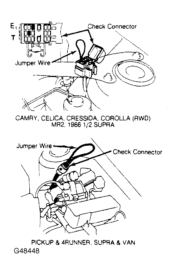 - Turn ignition switch to "ON" position. DO NOT start engine. Using a sub-wire, short terminals T - E1 of "CHECK ENGINE" connector. See Figure.