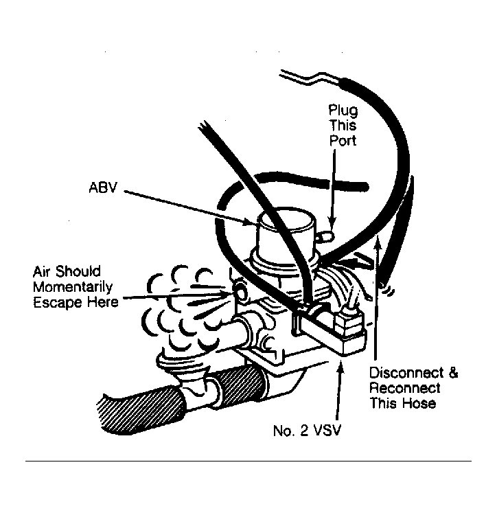 - Check operation of air by-pass valve (ABV). Disconnect air hose between ABV and exhaust pipe at ABV. Disconnect vacuum hose between ABV and No. 2 VSV at ABV and plug ABV port. With engine idling, disconnect and reconnect vacuum hose between ABV and vacuum pipe at ABV. See Fig 1. Compressed air should momentarily escape from ABV. Reconnect air hose to ABV.