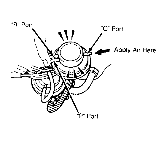 2. Apply air pressure through remaining port. Air should pass freely through air filter side. On 3 port models, disconnect all hoses. Block "P" and "R" ports. Apply air pressure to "Q" port. See Fig 1. Air should pass through the air filter side freely.