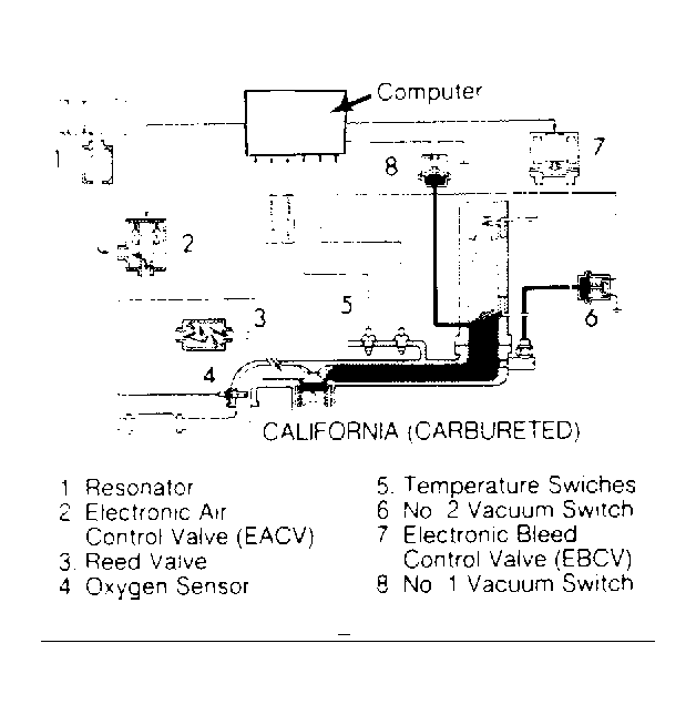 Air suction system uses exhaust gas pulses to draw air into the exhaust manifold or catalytic converter to help complete oxidation of emissions. See Figure- Figure. The air suction system on California Pickup (Carbureted) models is computer controlled and therefore is closely tied with the carburetor/fuel feedback control system. See Figure- Figure . See appropriate CEC article in the COMPUTERIZED ENGINE CONTROLS section. for information and testing of vehicle speed sensor, temperature switches, and oxygen sensor.