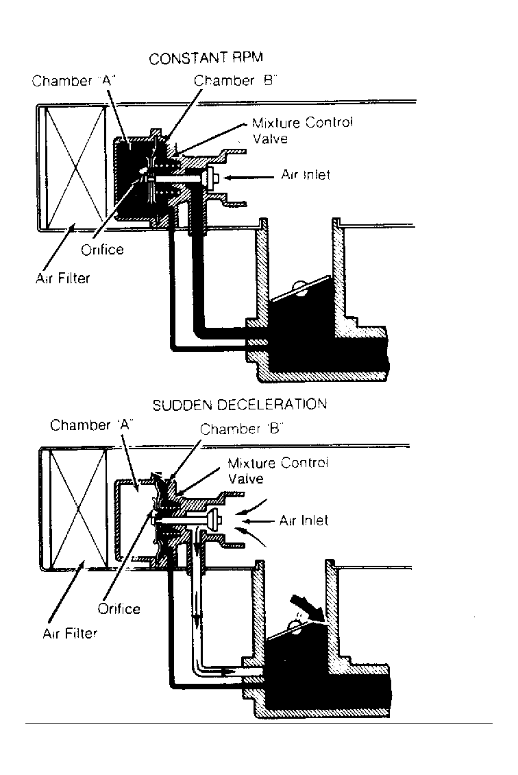 During sudden deceleration, high manifold vacuum activates chamber B of MC valve. The valve opens and fresh air is drawn through MC valve filter into intake manifold. After a few seconds, vacuum in both chambers will equalize through orifice. MC valve closes and stops additional air entering intake manifold. See Figure.