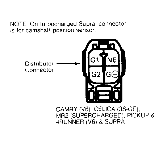 - On models with 4 wires in distributor connector, measure pick-up coil resistance between terminals "G1" and "G(-)", between "G2" and "G(-)", and between "NE" and "G(-)". See Fig 1 and Fig 2