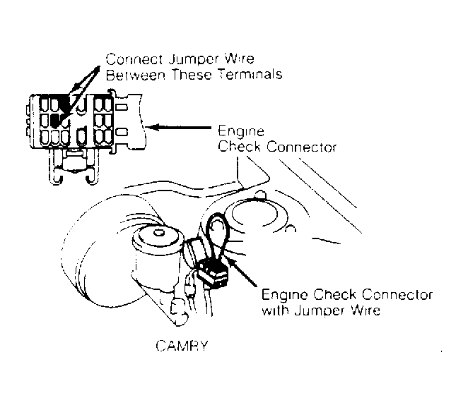 - To enter diagnostic mode, turn ignition on. DO NOT start engine. Install jumper wire between terminals of engine check connector. See Fig 1.