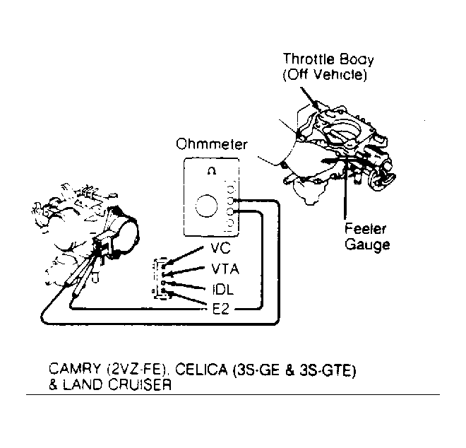 Turn ignition off and disconnect electrical connector at TPS. Note terminal identification. See Fig 1. Insert specified thickness feeler gauge between throttle stop screw and throttle ever. See TPS RESISTANCE SPECIFICATIONS table. Using an ohmmeter, check for resistance or continuity. Replace or adjust TPS if not within specification.