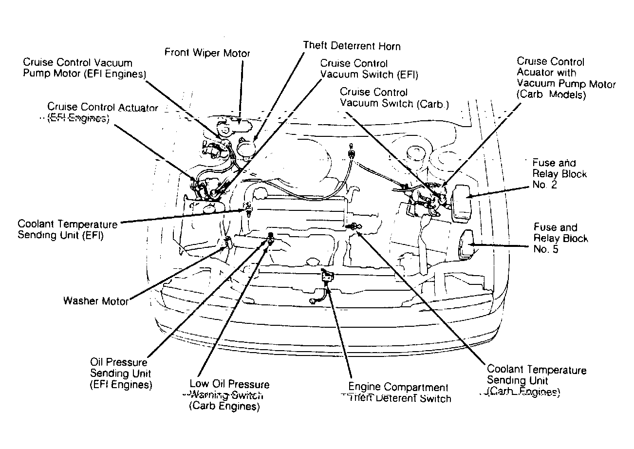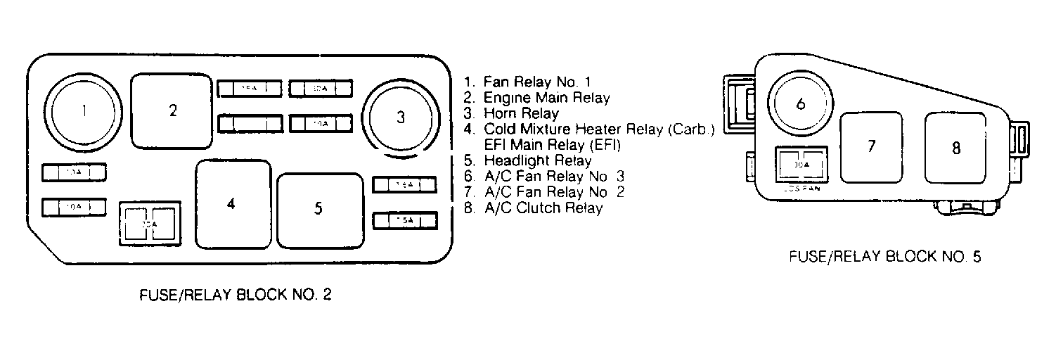 | Fuse/Relay Block No. 5 | On left front side of engine compartment. See Figure. |