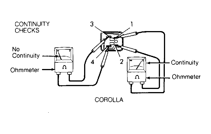 - Check that continunity is present between terminals No. 1 and 2. No continuity should be present between terminals No. 3 and 4.