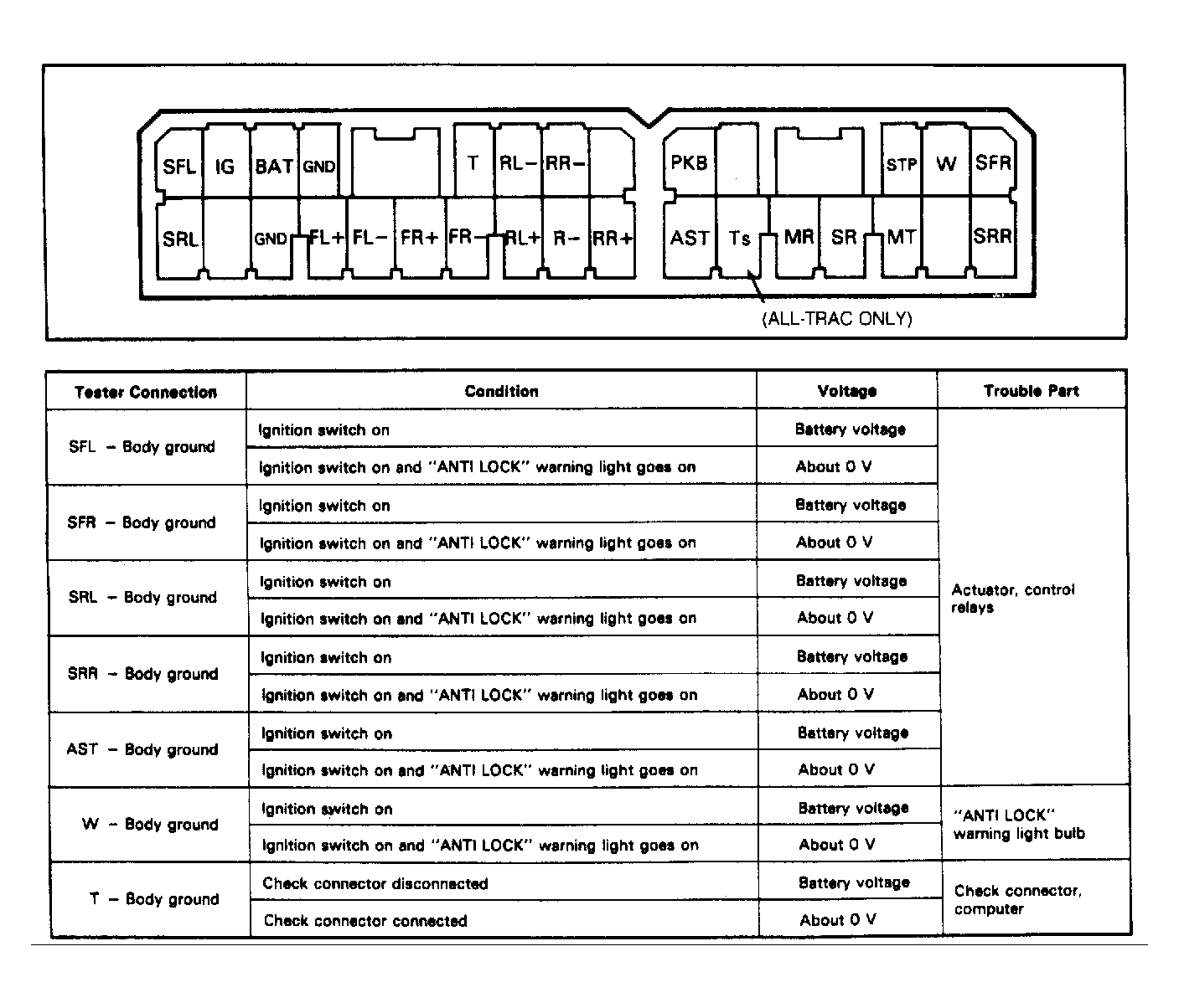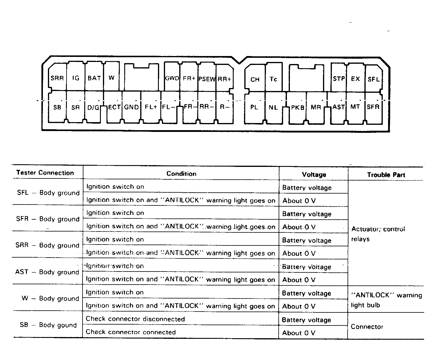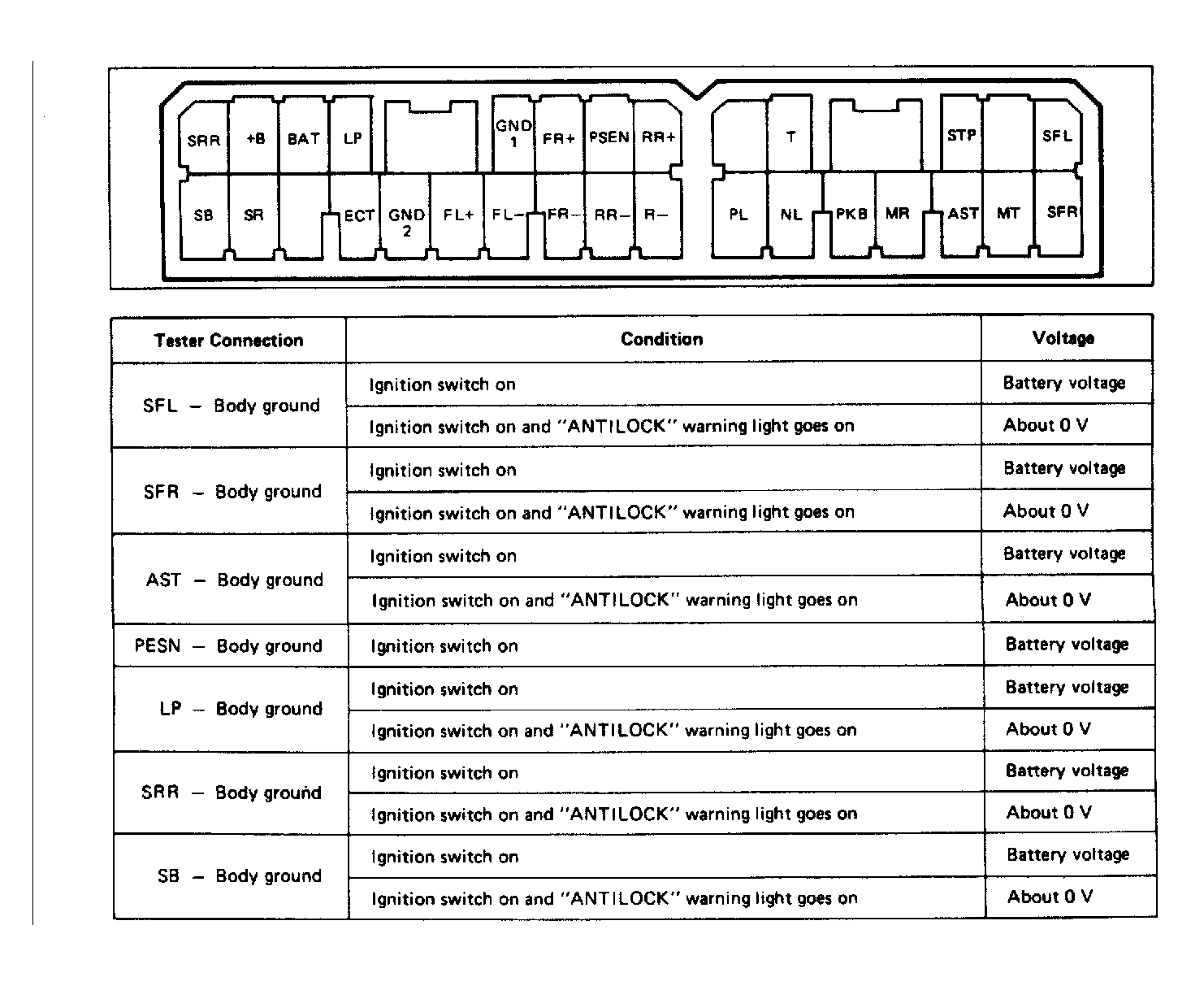 Check for voltage readings by back-probing connectors at ABS computer with computer connected. See Fig 1, Fig 2 or Fig 3 .