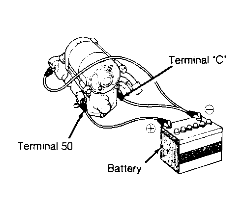 Connect 2 battery negative leads to terminal "C" and ground. Connect a 12-volt battery positive lead to solenoid terminal "50". See Fig 1. Plunger should extend firmly. If not, replace solenoid.