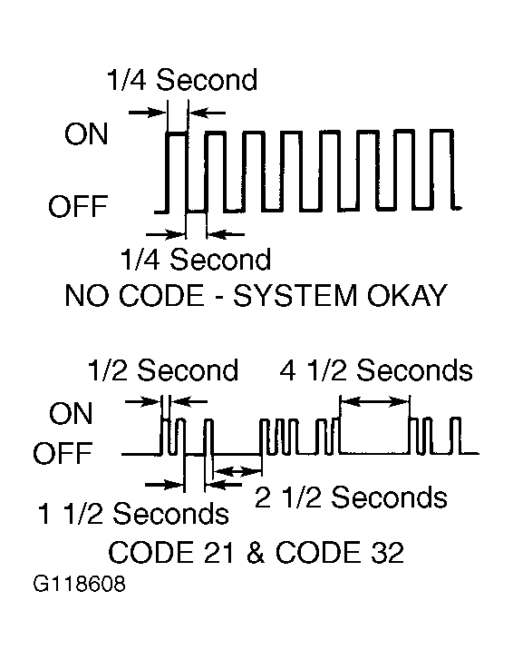 - A trouble code will be identified by a .5 second flash on and off for the first number. A 1.5 second pause will occur followed by the second number. See Fig 2.