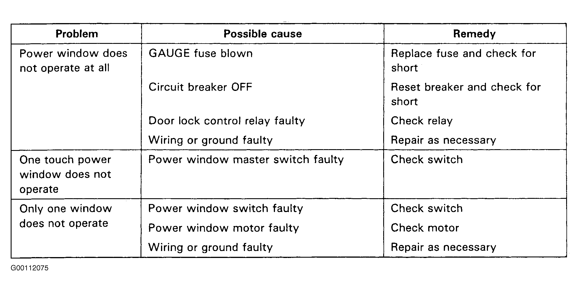 Verify customer complaint by operating system. Visually inspect for obvious signs of mechanical and electrical damage. Inspect for blown fuses and damaged relays. Inspect for loose or corroded connections, and damaged wiring harnesses and/or switches. Check for a broken or partially broken wire inside insulation, which could cause system malfunction but prove good in a continuity/voltage check with system disconnected. Ensure any aftermarket electronic equipment is properly installed. If fault is found, repair as necessary. To trouble shoot power window control system, see Fig 1.