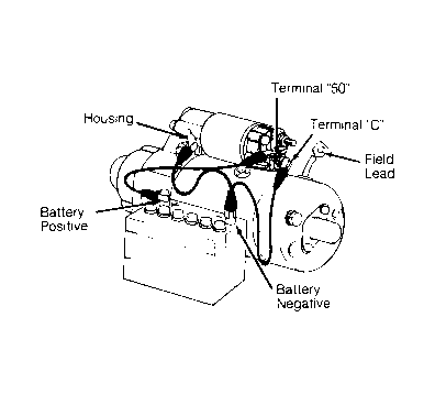 Connect test leads to starter. See Fig 1. Connect negative leads to starter housing and terminal "C". Battery positive lead is connected to terminal "50". If starter pinion gear does not move out, replace solenoid.