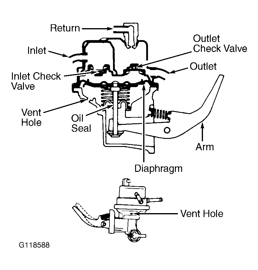 - Check pump diaphragm. Block off inlet and outlet fittings. Ensure pump arm locks. Check oil seal. Block vent hole and ensure fuel pump arm locks. If fuel pump does not operate as described, replace pump.