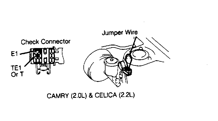 - Install jumper wire between terminals TE1 (or T) and E1 of check connector located near left shock tower. See Fig 1. Engine RPM should increase to 1000-1300 RPM for 5 seconds and then return to idle.