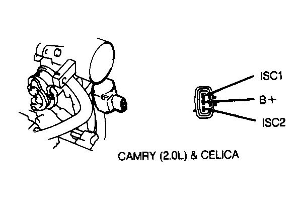 - Unplug ISC valve connector on bottom of throttle body. Using ohmmeter, measure resistance between terminals B+ and ISC1, and between ISC2 and B+. See Fig 2. Replace valve if resistance is not within 19.3-22.3 ohms.