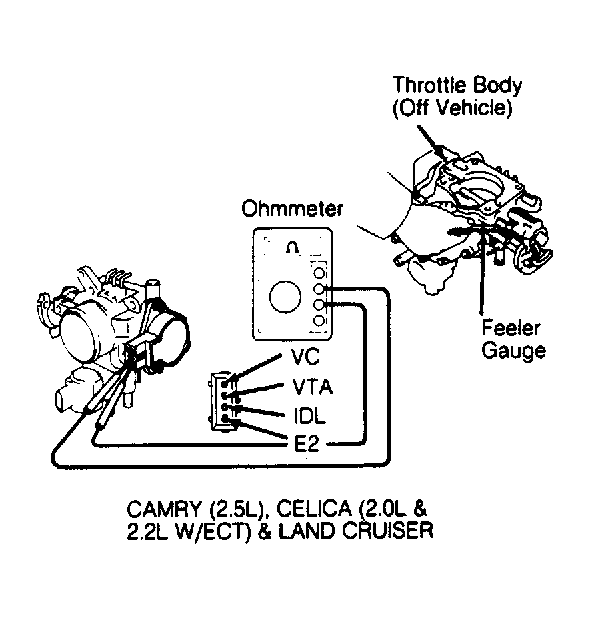 - Unplug throttle position sensor connector from throttle position sensor. Short terminals IDL and E1 (or E2) on wire side of connector. See Figure for terminal identification.