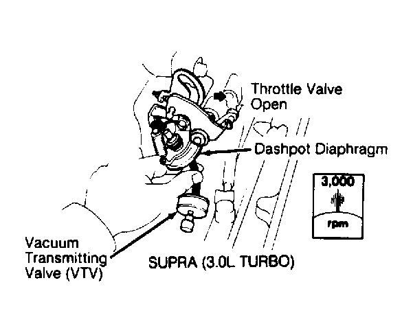 - To check VTV, run engine at 3000 RPM. Pinch vacuum hose between VTV and dashpot. Release throttle. Release pinched hose. Engine should return to idle within about one second. To check VTV off of vehicle, see Fig 5.