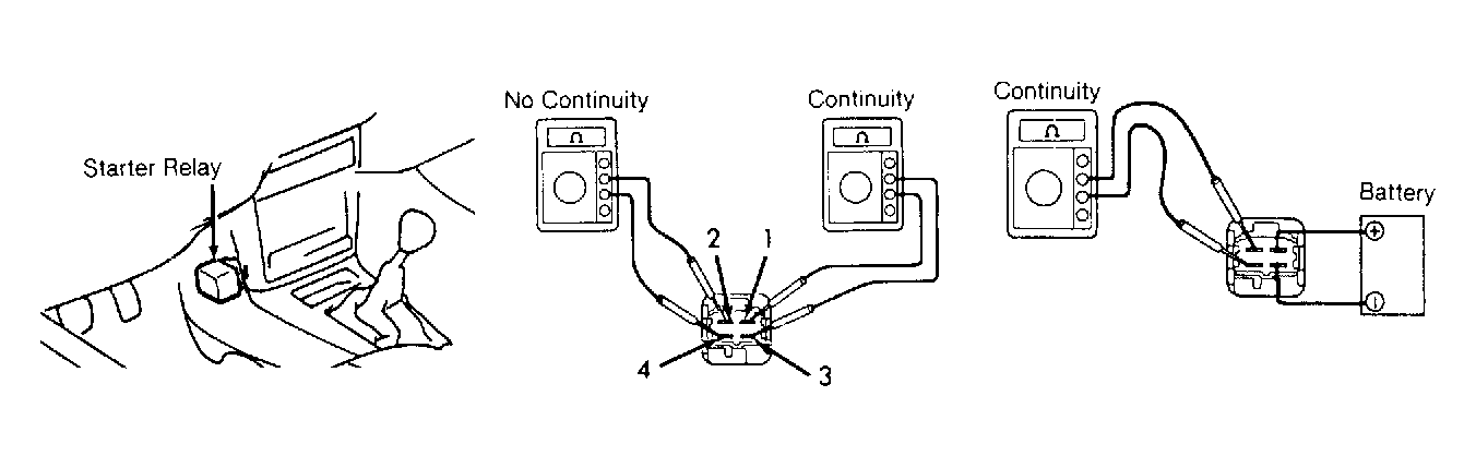 - Check relay operation. Apply battery voltage between terminals No. 1 and 3. Continuity should now exists between terminals No. 2 and 4. If relay does not test as indicated, replace relay.