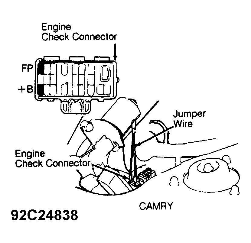 - Tighten union bolt. Reconnect negative battery cable. Install jumper wire between +B and FP terminals of engine check connector. See Figure & 2. Turn ignition on and note fuel pressure. Fuel pressure should be within specification. See FUEL PUMP PERFORMANCE table.