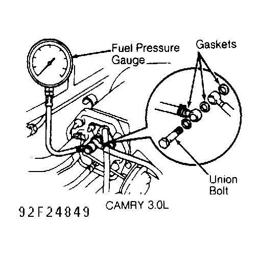 - Note location of fuel pressure gauge installation. See Fig 1 & 4. Cover union bolt with shop towel and slowly loosen union bolt to relieve fuel pressure. Remove union bolt and gaskets. Install Fuel Pressure Gauge (SST 09268-45012), using NEW gaskets. See Fig 1 & 4.