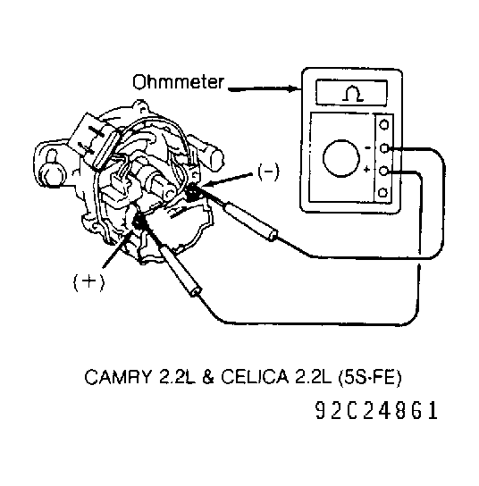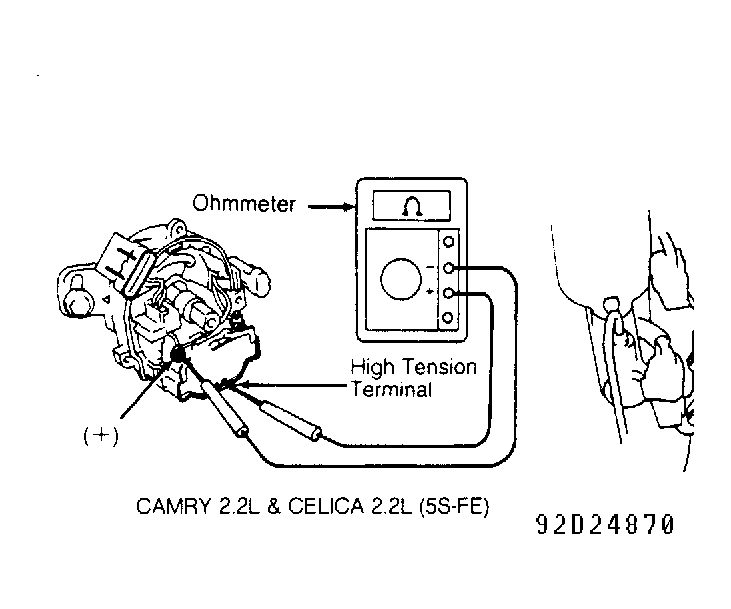 - Check secondary resistance between ignition coil positive (+) terminal and high tension wire terminal (coil wire tower). See Fig 6-25. Replace ignition coil if resistance is not within specification. See IGNITION COIL RESISTANCE table.