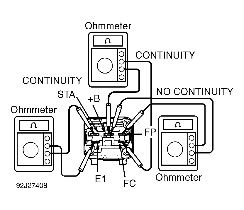 - Check circuit opening relay operation by applying battery voltage and checking continuity between specified terminals. See Fig 1 & Fig 2 . Replace circuit opening relay if defective.