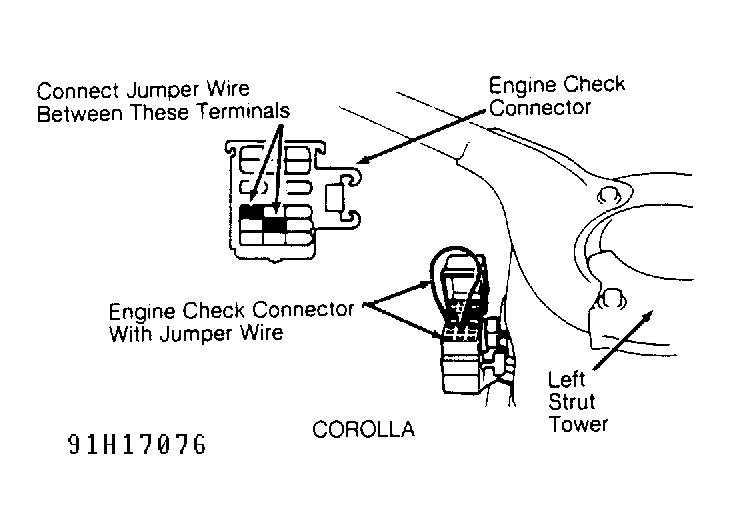 - Turn ignition on with engine off. Install jumper wire between terminals TE1 (or T) and E1 in engine check connector. See Fig 1.