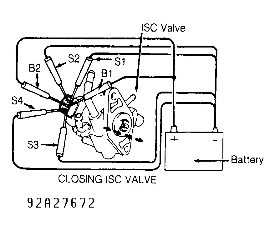 Terminals Ohms B1 To S1 Or S3 10-30 B2 To S2 Or S4 10-30 NOTE: Before removing ISC valve, drain coolant from cooling system. Remove both coolant by-pass hoses. - To check ISC valve operation, remove ISC valve. Apply battery voltage to terminals B1 and B2. See Fig 2 and Fig 3 . Repeatedly ground terminals in sequence and ensure ISC valve closes and opens. See ISC VALVE GROUNDING SEQUENCE table. Replace ISC valve if defective.