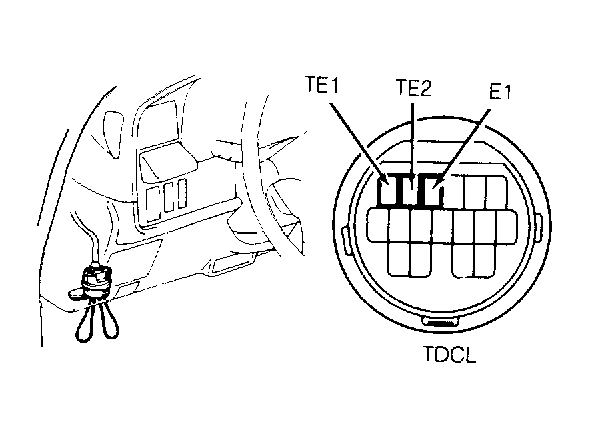 - To enter test mode, install jumper wire between terminals TE2 and E1 terminals in Toyota Diagnostic Communication Link (TDCL), located under left side of instrument panel. See Figure.