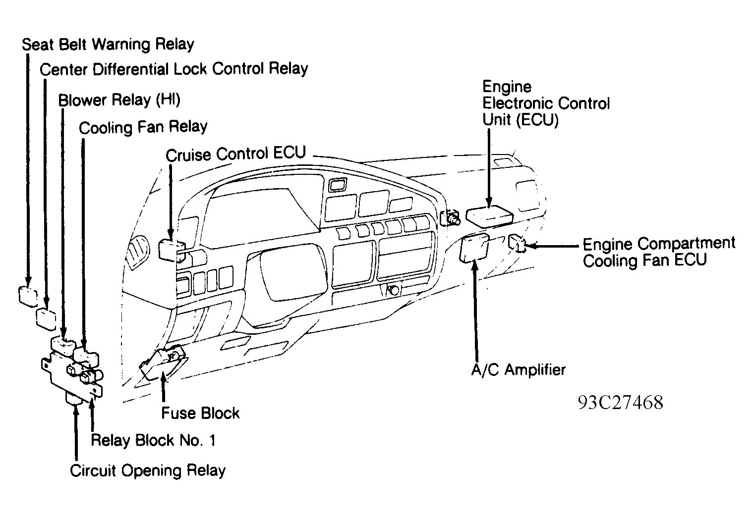 | Cruise Control ECU | Behind left side of instrument panel, left of cluster. See Figure. |