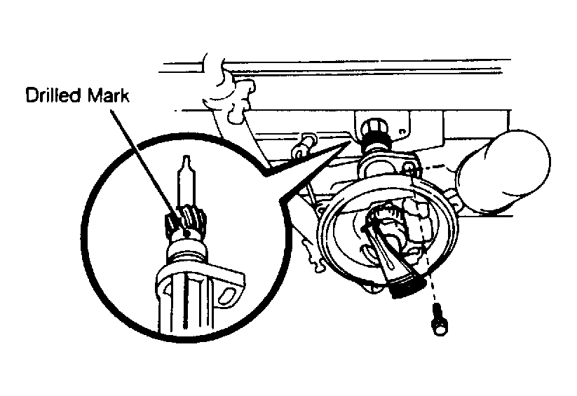 - Remove spark plug from cylinder No. 1. Place finger over spark plug hole. Turn crankshaft clockwise until pressure is felt. This indicates cylinder No. 1 is coming up to TDC of compression stroke. Align timing marks at flywheel opening above starter. Install spark plug. Turn oil pump shaft slot about 25 degrees from perpendicular to engine block. See Fig 1.