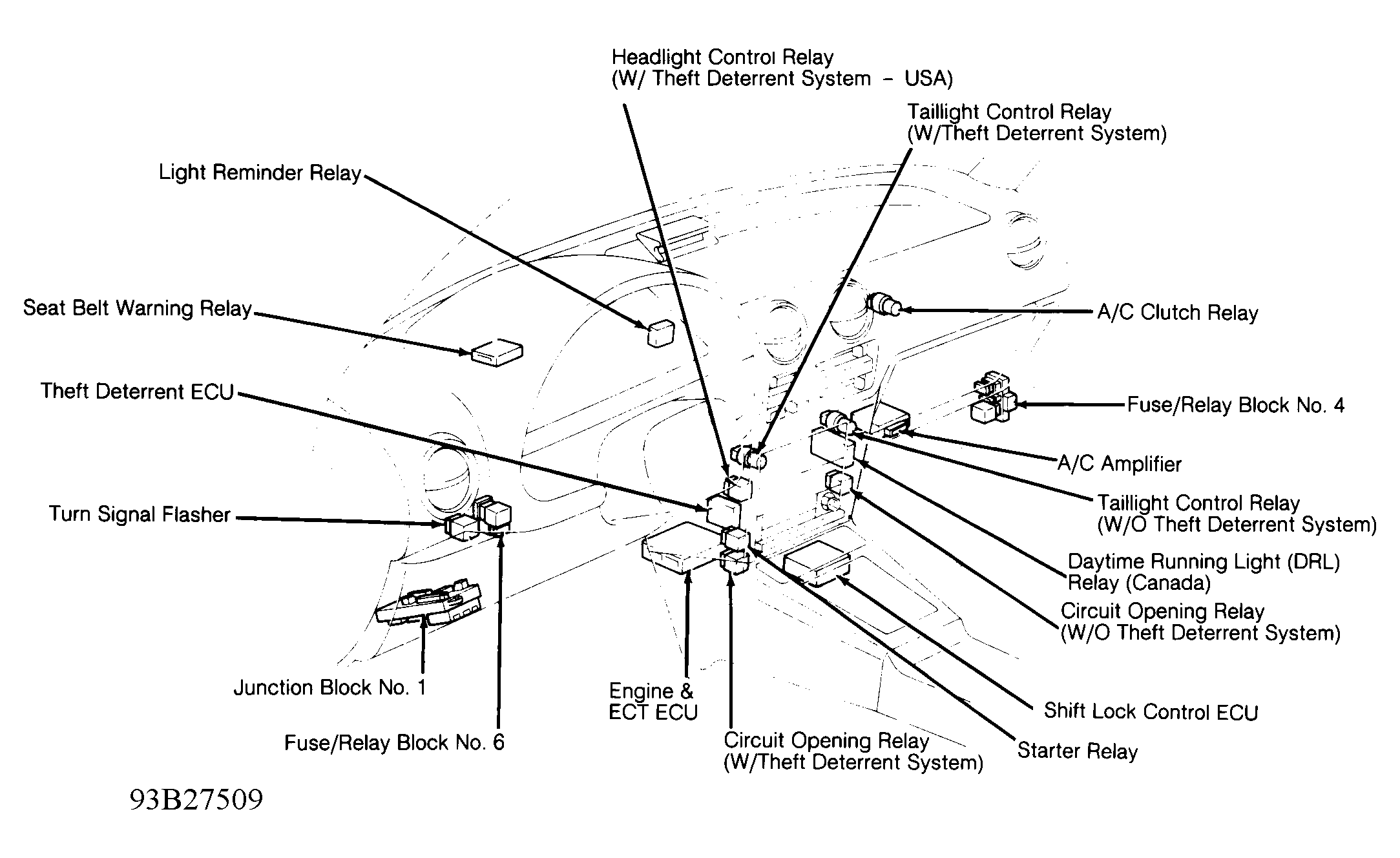 | Theft Deterrent ECU | Behind radio & ashtray, in center instrument panel. See Figure. |