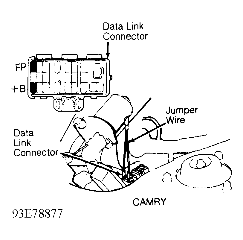 4. Install jumper wire between +B and FP terminals of data link connector. See Figure. The data link connector is located in engine compartment.